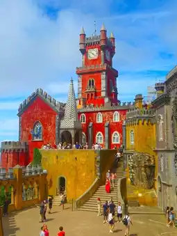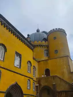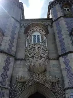 As you get closer to the palace, the harmony of colors, resembling a stack of toy blocks, is astonishing. The red tower, yellow walls, gray stone fortress, and blue sky come together to create a fairytale-like scene. The building features a unique blend of Gothic, Mudéjar, Renaissance, and Manueline styles, with intricate patterns, tile decorations, and statues showcasing the craftsmanship. Particularly striking is the Triton sculpture above the entrance, depicting the sea god supporting the palace, one of Pena Palace's most impressive details.