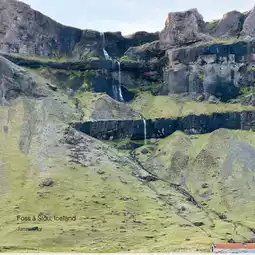 Foss á Síðu is a small but charming waterfall located along the Ring Road east of Kirkjubæjarklaustur, Iceland. The waterfall cascades over 30 meters from a sheer basalt cliff amidst lush greenery and meadows. While not large, its slender form and stunning backdrop make it a popular photo spot along the tourist route.