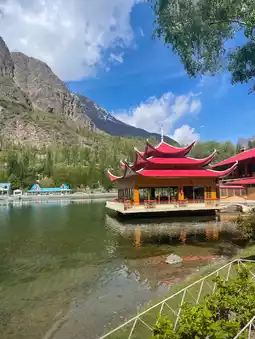 Kachura Lake in Pakistan is a breathtaking sight, with its reflective waters mirroring the surrounding mountains. The deep blue lake contrasts beautifully with the red pagoda nestled on its banks, adding a touch of elegance to the landscape. Serene and mesmerizing, it’s a place where nature and architecture blend perfectly, creating a picture-perfect retreat.
