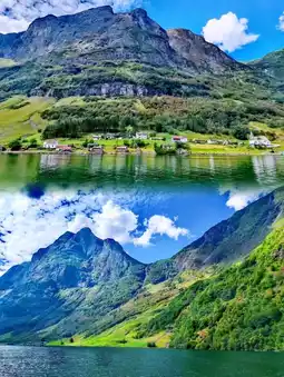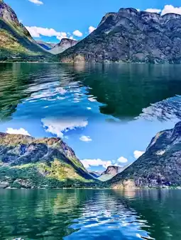 From the bow of the boat, I saw many small mountain towns dotted along the banks of the deep fjord, nestled against the backdrop of majestic peaks. It was a truly beautiful sight. I was lucky enough to have clear skies that day, and the blue sky, white clouds, and mountain peaks reflected in the water were even more captivating.