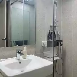 Lastly, the bathroom! There is no bathtub in the bathroom, but it has a shower booth, so it was comfortable to use!~ And the bathroom also has high-quality large towels.