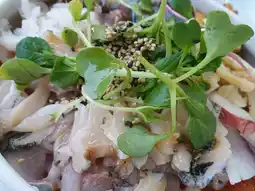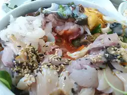 Sea cucumber and abalone mixed raw fish restaurant is piled high with various seafood