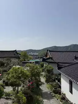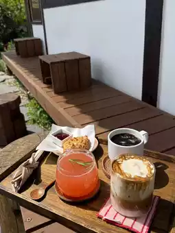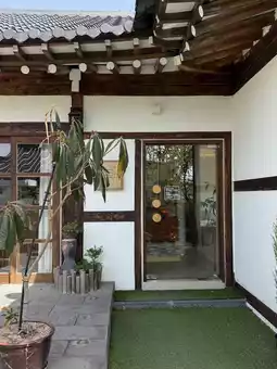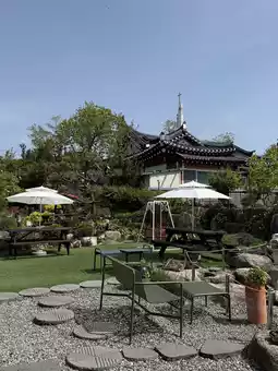 The cafe is a renovated traditional Korean house (hanok) with a beautifully landscaped outdoor yard seating area, making it an even better destination on a nice weather day.