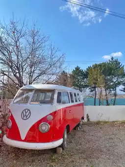The sparkling Yeongrangho view and vintage caravan interior in the accommodation yard are the highlights 🚗✨