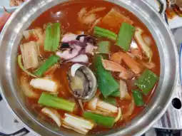 The raw fish soup with various seafood is a good food that naturally makes you think of alcohol.