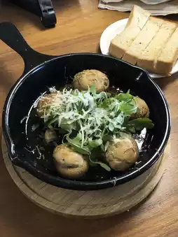 This signature dish features a crispy-on-the-outside, moist-on-the-inside baguette, topped with a generous layer of mushroom, black olives, and savory cream cheese.