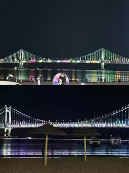 After dinner, we walked along Gwangalli Beach and admired the night view. 🌃. The harmonious combination of the sparkling Gwangan Bridge and the ocean was truly beautiful, making for perfect photo opportunities. It was a time that offered a different charm than the daytime.