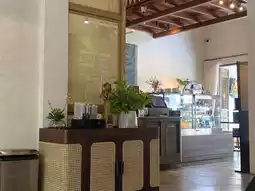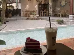 Hello everyone, today I'm going to take you on a tour of Old Town Songkhla. Here is the Amazon Cafe, which is arguably the most beautiful in Songkhla. The cafe is decorated in a vintage style that matches the old town, providing a relaxed atmosphere perfect for those who want to sit back and work in a calming environment. Inside, there are classic photo zones, a two-story wooden house, and a small waterfall pond that is very refreshing. The restrooms are clean and have a great vibe. I highly recommend visiting when you come to Old Town Songkhla.