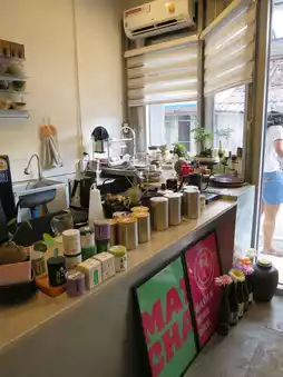 The shop is a tea house. It's not very big. The interior is decorated in a light Japanese style. In addition to selling matcha and sweets, the shop also sells matcha cups, matcha brushes, various brewing equipment, and premium matcha powder.