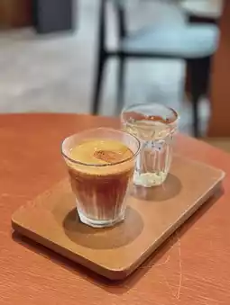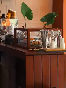 It is a small, cute coffee shop. The shop is decorated in a wooden style.