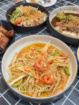 • "Somtam with small noodles, fresh shrimp, crispy pork" received positive reviews. "Spicy, rich, and spicy papaya salad with fermented fish sauce."