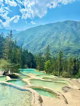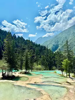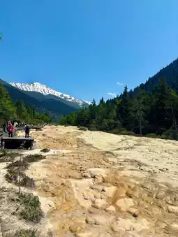Despite a slight headache due to the altitude sickness, when one sees the layered colorful pools in Huanglong, it's easy to understand why it's called the 'Jade Pool' on Earth. The crystal-clear waters of the pools change colors with the surrounding scenery and the angle of the sunlight. Visiting in spring, although it's not the high water season and some pools have low water levels, the beauty of the snow-capped mountains is still striking under the sunlight, making it even more dazzling and enchanting, like a fairyland on Earth.