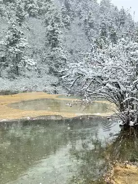 Autumn Snow Descends on Huanglong: A Dreamlike Spectacle of Five-Color Pools Dancing with White Snow