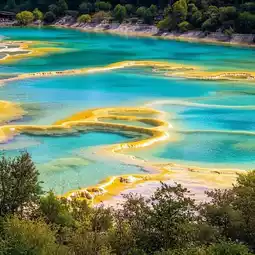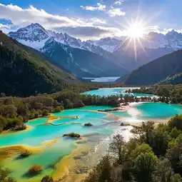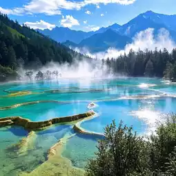 Huanglong's star attraction! The water in the calcified pools changes with the light, displaying shades of blue, green, gold, and red, like an overturned artist's palette! It's best to arrive before 9am, when there are fewer crowds and the light is perfect for photos 📸 (remember to bring a wide-angle lens!).