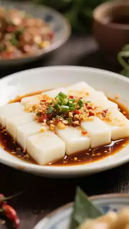 A local snack, rice tofu has a soft, sticky texture and is served with chili, scallions, and soy sauce. Street vendors sell it for just 5–10 yuan per serving.