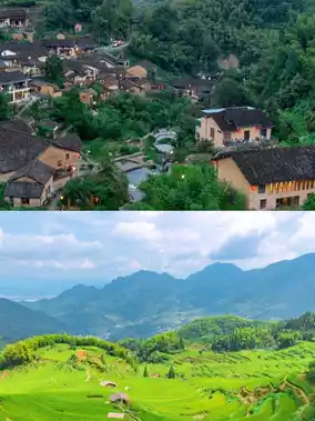 "Village in the clouds," located on a cliff edge, surrounded by bamboo forests and tea gardens. You can stay at cliffside guesthouses (like "Feiniaoji") or enjoy mountain views at the village entrance café ("Yunding Restaurant").