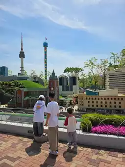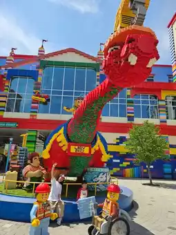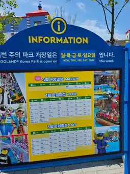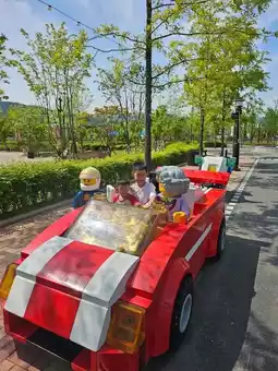 This option offers flexibility, with a travel time of about two hours. Once you exit Chuncheon Station, turn right and cross a small zebra crossing (no need to cross the main road). You'll see a sign with the shuttle bus schedule from LEGO Land to Chuncheon Station. Wait there for a red bus that will take you directly to LEGO Land. It's very convenient. The bus ride takes about 10 minutes, and as you approach the entrance, you'll be amazed, and the kids will be thrilled even before entering. All rides are available for children over 95cm tall. My younger child experienced his first outdoor roller coaster ride here.