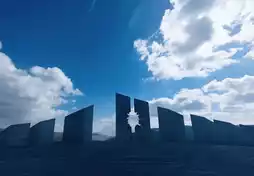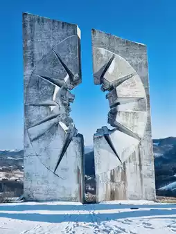 • Symbolism: The most distinctive feature is a 14-meter-high concrete tower with a huge bullet-hole-like opening in the center. The inner wall of the bullet hole has abstract human faces, which symbolize the violence encountered by the soldiers. Its height of 14 meters represents the distance between the Kardinjaca battlefield and the town of Užice. The tilted stones around it symbolize the state of a soldier falling down after being shot.