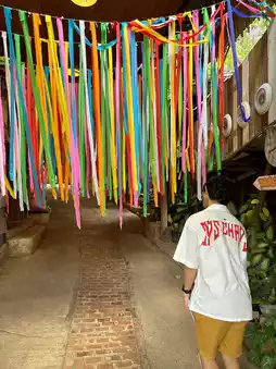 You have to pay an entrance fee of 60 baht per person, but you can exchange it for one candle. Inside, there's a restaurant, a drink shop, a photo corner, a bamboo bridge, and even a candle-making workshop. They also sell trinkets like key chains, bracelets, and other souvenirs.