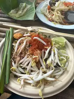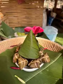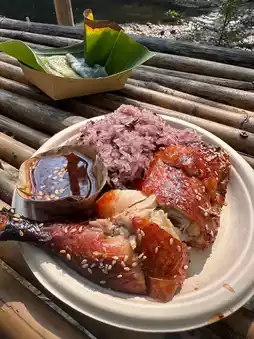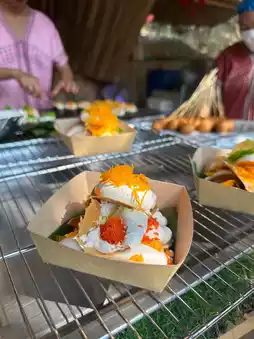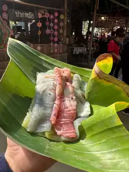 If you visit Suan Phueng and don’t stop by Oh Poi Market, can you really say you’ve been here? Personally, I love this market. Whenever I come to Suan Phueng, I make sure to visit. In the morning, there’s a unique activity where monks float down the stream on rafts for alms-giving. After offering alms, you can explore the market for food and enjoy your meal by the stream. The market provides seating for visitors. They use eco-friendly containers, which is a great touch. My favorite part is the traditional ice cream. The packaging is so well-designed that it’s hard to resist buying more than one, especially for an ice cream lover like me! 🤭🤭