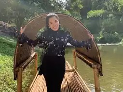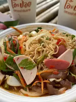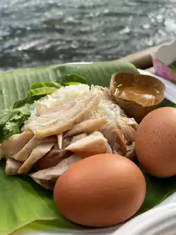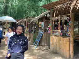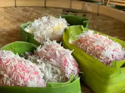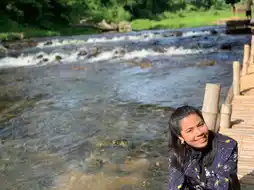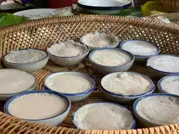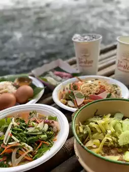 The food containers are biodegradable, with no plastic bags. There's a seating area for eating and relaxing by the stream. The market is shady, with the sound of a flowing stream. The water is crystal clear and cool. In the morning, alms are offered to monks on rafts.