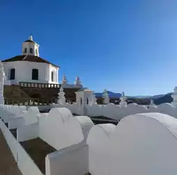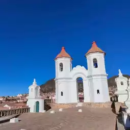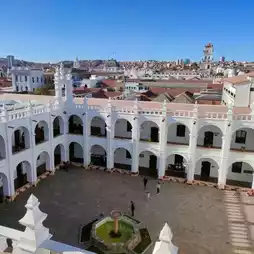 The courtyard and the church are beautiful, but the best thing here is the rooftop. You can actually climb up onto the roof of the church. The roof of the church is not flat, but wavy, and there are several bells. You can see the white city of Sucre, which makes you think you are in Europe. This is the only place in Bolivia where you can see such a view.