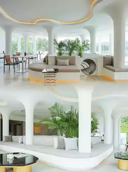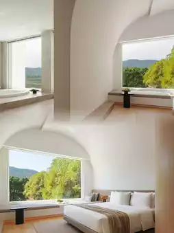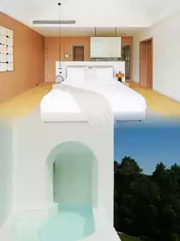 The hotel's design inspiration seems to stem from the woods by the lake, with water as the central element of the design, reflected in its swimming pool and waterscapes, as if echoing the nearby Xianxia Lake. Miwo's design employs an off-white color, creating a treehouse feel. Stepping out from the lobby, one finds the swimming pool, and in summer, from the pool to the bar, the expansive lawn is an excellent venue for parties.