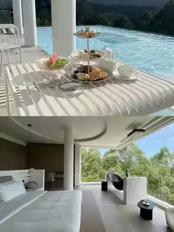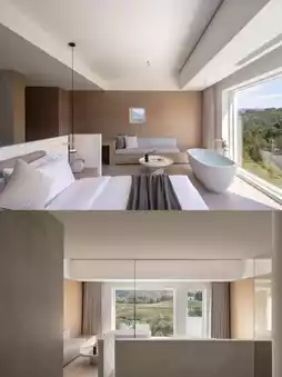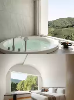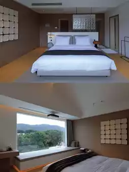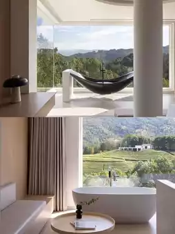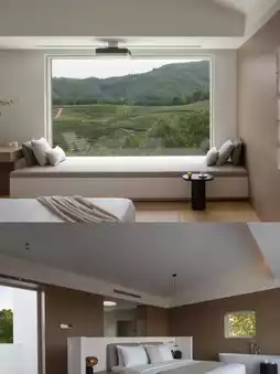 7 minimalist-style rooms create a natural healing atmosphere. Some rooms are independent suites equipped with cave-style soaking pools, allowing you to enjoy the tea garden scenery while bathing. The 90° oversized floor-to-ceiling windows bring in mountain views, and you can quietly enjoy tranquility in the cradle bathtub, falling asleep with the mountain.
