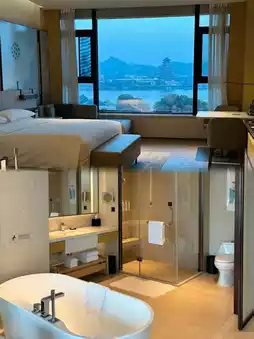 I stayed in a deluxe suite. The room was spacious, with a simple and elegant design that combined modern and natural elements. The room was equipped with large floor-to-ceiling windows, offering a panoramic view of Guanyin Lake and the beautiful night view. The bedding was very comfortable, and I slept very well. The room was also well soundproofed, and it was very quiet all night.