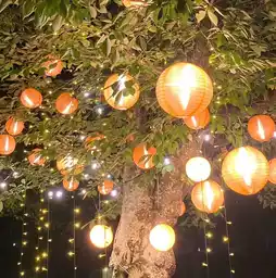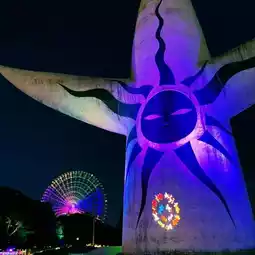 The illuminated Tower of the Sun and the colorfully lit lanterns create a fantastical atmosphere.