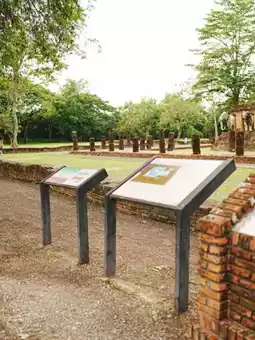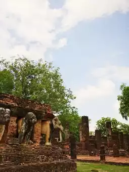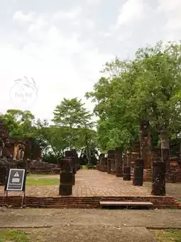 💕 Wat Chang Lom is a very large temple. The temple grounds are surrounded by a moat measuring 100x157 meters. It is located in Sukhothai Historical Park. It is an important and beautiful ancient site. The main chedi is a bell-shaped chedi. The base of the chedi is made in the shape of 32 elephants (stucco in the shape of half an elephant). There is a circumambulation area around it. There is a chapel in front of the chedi. There are surrounding chedis. There is a first layer of glass walls before the moat layer. Outside the moat, to the east, there is a chapel (church) with a separate moat. In front, there is a brick chapel base and a brick wall base.
