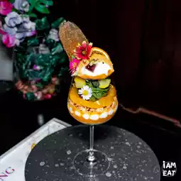 Matcha parfait with dried oranges and roasted dragon fruit. Add a Japanese touch with red bean mochi and white miso ice cream, contrasting with matcha mont blanc cream and smooth vanilla ice cream. Add freshness with fresh Japanese oranges and orange sorbet. Add texture with crispy rice, strawberry cheese cream and soybean panna cotta with almonds. Ending with Matcha Jelly (Yokang)