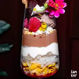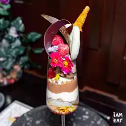 Chocolate Parfait Melting Kiss 690.- Luxurious chocolate parfait with many textures, starting with sweet and sour orange jam contrasting with rich dark chocolate, fresh pear adds freshness, served with soft chocolate ice cream, alternating layers with almond sponge cake, caramel cream and chocolate mousse, ending with pear sorbet, crunchy corn flakes and sweet strawberry sauce