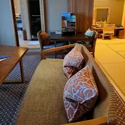 It is a very spacious room with a large dining table that can seat five adults, a Japanese-style tatami room where you can lie down, and a twin bed.