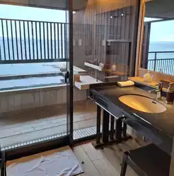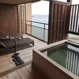As soon as you go out to the wooden terrace from the dressing room, there is an open-air bath, and next to it there are two chairs where you can relax after a bath.