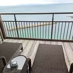 When you enter the room, you can see the sea and sky from the large window at the back.