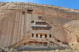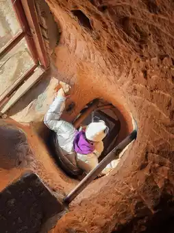๐ Thirty-Three Heavens Grottoes. Continue driving to another parking lot. After parking, walk into the mountains for about 20 minutes to reach the Thirty-Three Heavens Grottoes. This is the landmark building of Mati Temple, consisting of 21 grottoes on 7 levels, excavated in the shape of a pagoda on a 100-meter-high red sandstone cliff. Reaching the top requires passing through narrow passages and hanging ladders, symbolizing the "path to liberation" in Buddhism. After reaching the top, you can overlook the scenery of the Qilian Mountains. People who are afraid of heights should be cautious, as the grottoes' tour route is entirely on the cliff. Although there are sufficient protective measures, it still looks quite high.