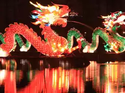 Experience the dazzling nighttime spectacle of the glowing, multi-colored dragons reflecting on the water's surface. Breathtakingly beautiful! Perfect for photography enthusiasts and those who enjoy a traditional Chinese festival atmosphere.