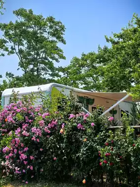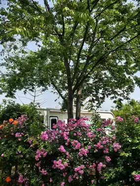 What appears from afar as a rose garden by the lake is actually a whimsical resort with RVs nestled among blossoms. Quiet courtyards fenced with vibrant flowers offer a peaceful retreat. Sipping tea or wine under the trees feels like stepping into a fairy tale.
