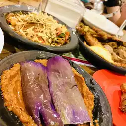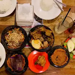 The dish with vegetables and meat topped with this sambal is called Penyetan. You can also choose the level of spiciness, so even those who are not good with spicy food can order with confidence. It's definitely a place you should visit.
