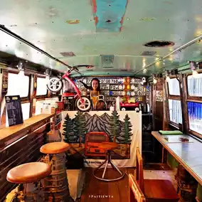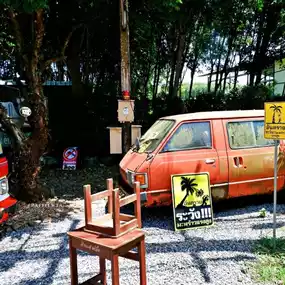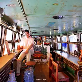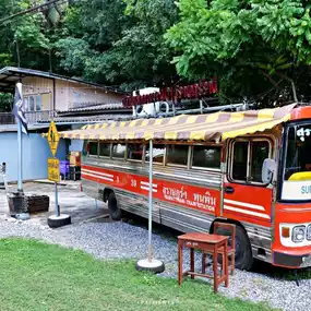 This Surat Thani-Phunphin bus has been transformed into a slow bar cafe. Inside the bus, there are seats with cool air conditioning, decorated with vintage lamps. Or if you want to sit outside, there is a place to sit under the trees, which is a student's desk, giving you a nostalgic feel. Ride a cool bus. They have a variety of drinks.