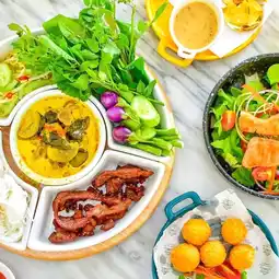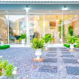 👉 The front of the shop is a cute white tunnel contrasting with the green trees with English-style decorations. Here, there are both air-conditioned seating areas on both sides, as well as an outdoor area with a garden-style atmosphere, but it may be more suitable for the evening. You can come to eat at the shop. The food menu is quite delicious. From what the admin asked, the chef came from a large restaurant in Bangkok, so I am very confident in the taste of the food.