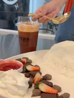 This is ECHO coffee roasters, a famous shop in Surat Thani. Their coffee is second to none. But this place doesn't just have coffee. They also have food and desserts. When we came here, we tried the bingsu menu. The milk bingsu has a well-rounded flavor and is not too sweet. It's very delicious. The kids love it. It comes with Kit Kat and strawberries. As for the matcha bingsu, adults will love it very much. It comes in a strong, not too sweet flavor. It's really delicious.