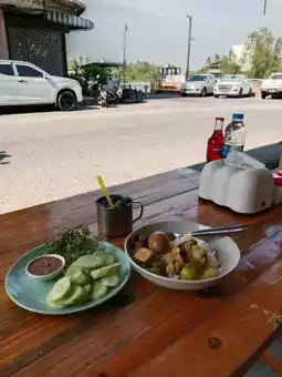 The menu I tried today was spicy southern-style green chicken curry with braised eggs, served with vegetables and shrimp paste. It tastes delicious and is affordable at only 50 baht. You can eat your meal while enjoying the river view and the cars passing by. It is a way of life of the people in the community that you can't find in the capital.