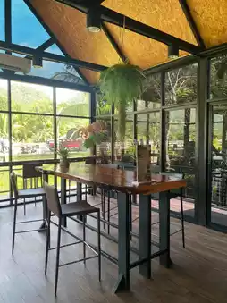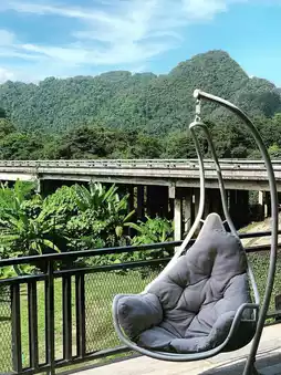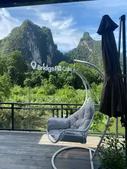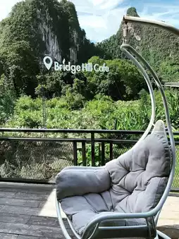 A cafe nestled in a valley with a bridge view, located in Khao Sok ⛰ Surat Thani Province, is so beautiful you can't even drive past it. Stop in for a cup of coffee and enjoy the view. Located right next to the bridge and mountains, just like the name suggests, Bridge Hill 🎶