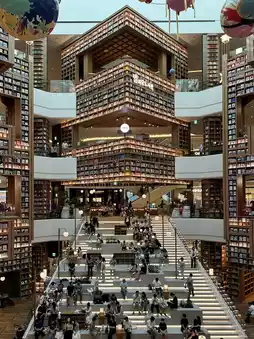 The Byeolmadang Library at Starfield Suwon is a large open library located in the center of the shopping mall. It features impressive three-story-high bookshelves, making it a landmark space. With its open structure filled with natural light, the library combines books and art, creating a welcoming environment for everyone to enjoy freely. 👏