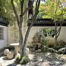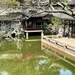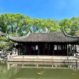 The pond, plants, Chinese architecture, and Taihu stones are beautifully arranged, as seen in Suzhou-style gardens.