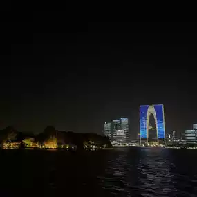At night there’s a wonderful light show on the building and a few others and watching it from across the River is spectacular . Seeing the building🏙️ both during the day and nighttime 🌇is impressive . There’s are hotels 🏩and several restaurants 🍽️around it as well as some tourist attractions .