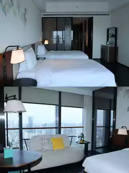 The hotel is on the 46th floor, with a super high view. Standing in front of the 360-degree panoramic floor-to-ceiling windows in the lobby, you can enjoy the beautiful scenery of Suzhou. During the day, you can see the sparkling ancient canal, and at night, the dazzling lights create a stunning night view!