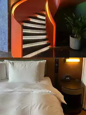 Hotel Indigo has a youthful design, with bold colors and lines. The public areas are trendy and I like them a lot. The pool is beautiful, especially at night when the lights are on, creating a lakeside atmosphere. The hotel has fireworks shows on Friday and Saturday nights, but I missed them this time. The hotel also allows guests to bring their own fireworks. Watching fireworks on the peninsula should be nice.